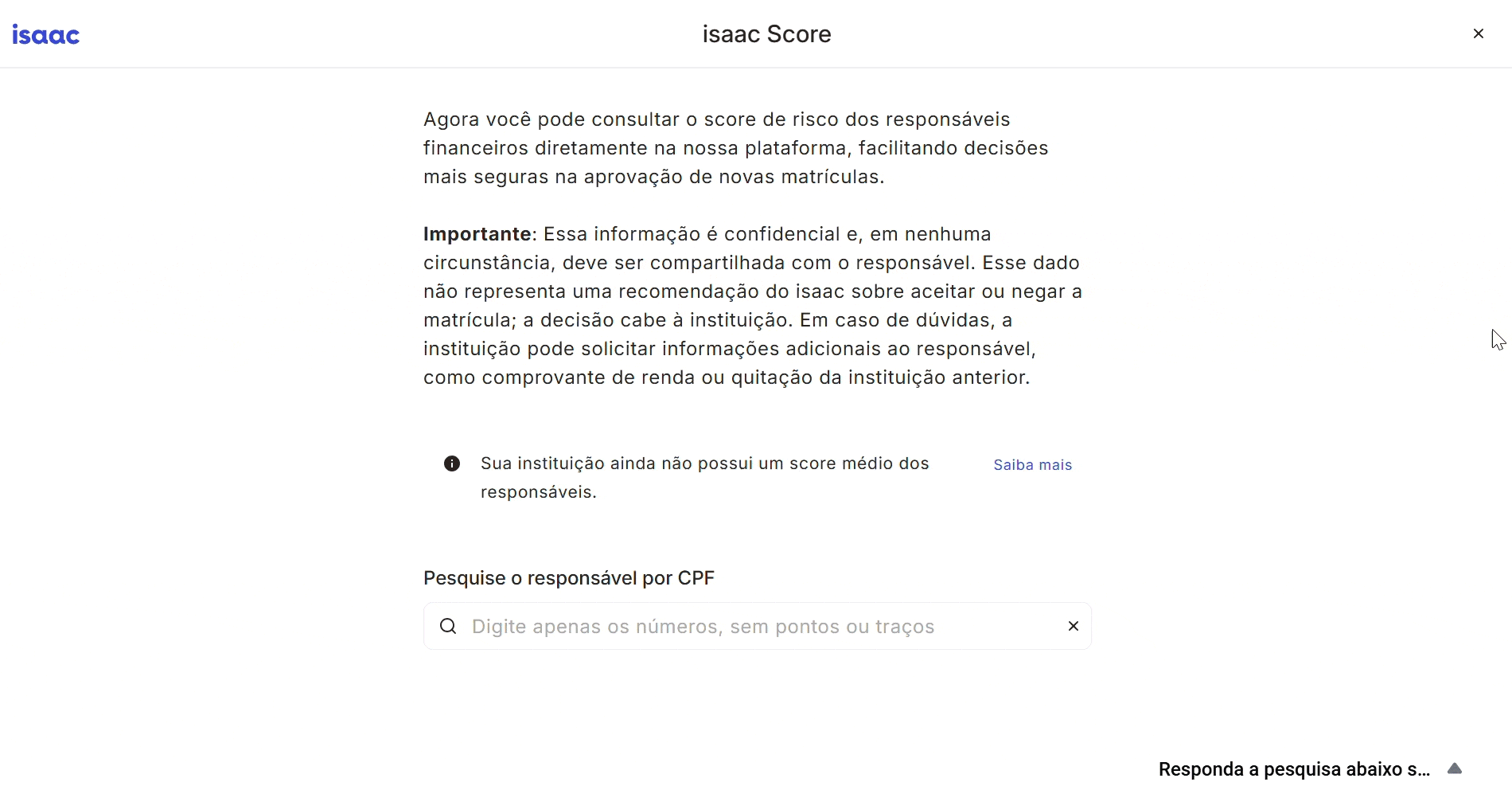 O isaac Score atende a esta demanda, com dados que permitem que as instituições de ensino tomem decisões bem-informadas, com base na avaliação integrada do risco financeiro, baseada em dados externos e informações da plataforma própria, sem custo extra.