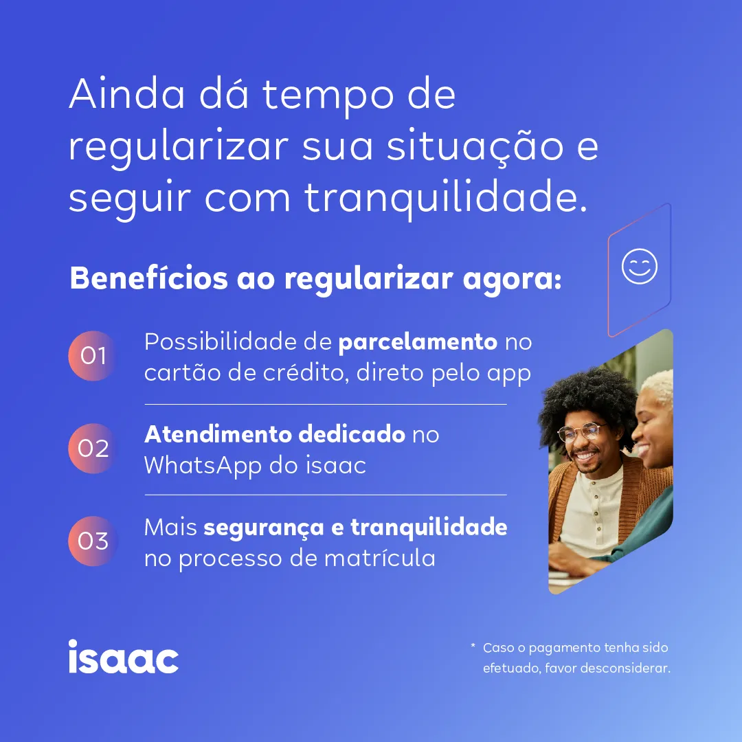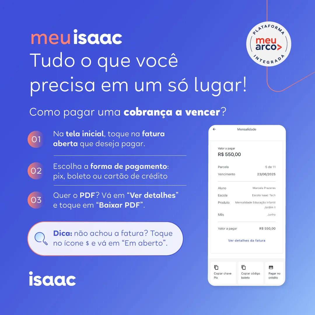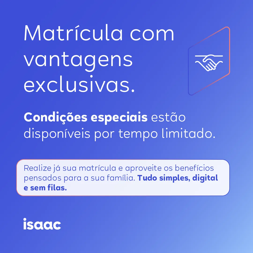 Com elas, você comunica de forma clara que as matrículas estão abertas, reforça o apoio do isaac e mostra às famílias como esse processo será mais simples e seguro.