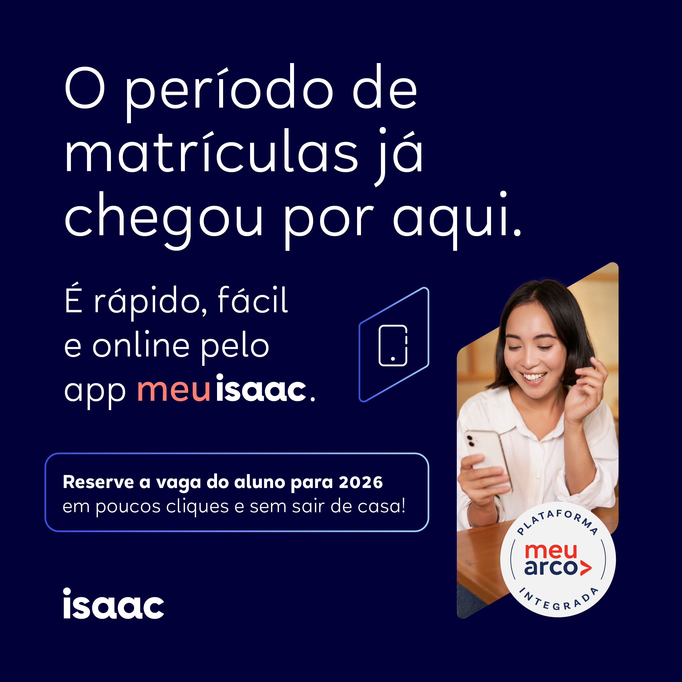 Com elas, você comunica de forma clara que as matrículas estão abertas, reforça o apoio do isaac e mostra aos alunos como esse processo será mais simples e seguro.