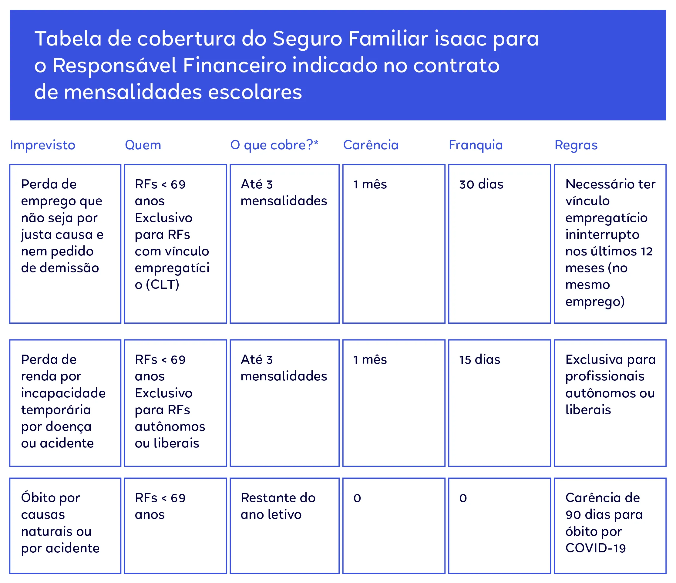 O Seguro Familiar isaac tem vigência para o ano relativo ao contrato de mensalidades. Para ser incluído na apólice, o responsável deve ter assinado o contrato e a escola deve ter aderido ao benefício. É válido para os responsáveis financeiros dos contratos que atendam às condições de cobertura e enquanto houver a parceria com o isaac. Caso a parceria entre a escola e o isaac termine ou o contrato de mensalidade se encerre, o seguro será cancelado imediatamente. Atenção: imprevistos ocorridos antes do início da vigência do seguro ou da assinatura do contrato não estão cobertos.